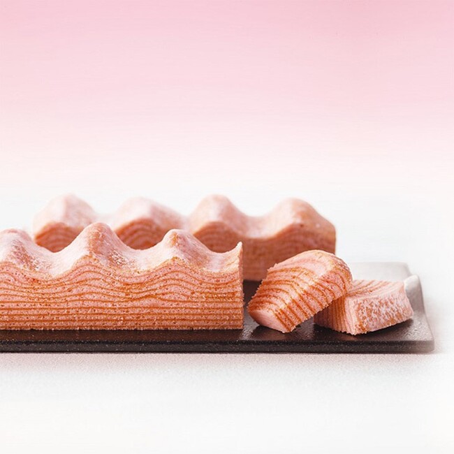 満開の桜のようなきれいな桜色。国産の桜葉を練り込んで、一層一層焼き上げました。