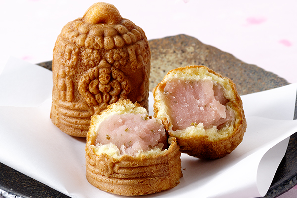 ピンクの桜あんをふんわり柔らかな伝統カステラ生地で包みました。刻んだ桜葉の清々しい香りが口の中に広がります。