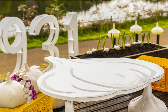青森屋敷地内にある公園が一望できる屋外のテラスを、にんにく尽くしの空間に設えます。屋根には、吊るしにんにくやにんにく灯篭が連なり、テーブルは天板も脚もにんにくの形です。収穫時に使用する箱をひっくり返したイスに座り、にんにくとビールを味わいながら、目でもにんにくを存分に楽しめます。