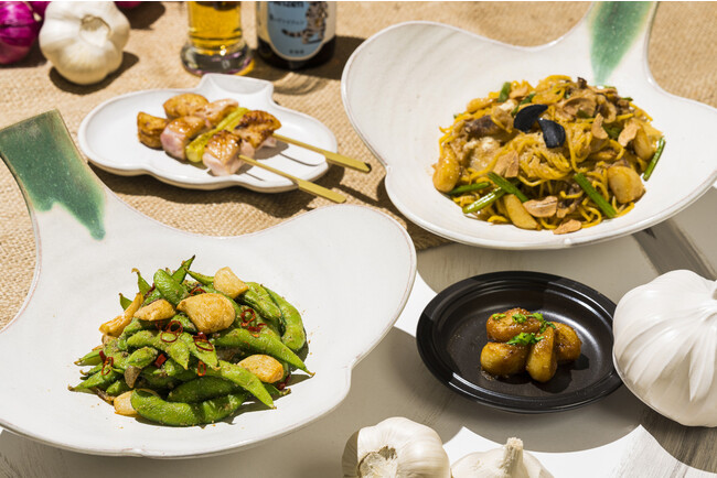 料理の風味付けに多く用いられるにんにくですが、ここではそのものの風味を楽しんでいただきたく、ビールと一緒に提供するのは、にんにくを主役にした全3種類のおつまみセットです。セットにはビールと相性の良い枝豆のにんにく炒めと、にんにくが主役のおつまみ1品が付いています。黒にんにく(*3)やにんにくの芽などが入った焼きそばや、味噌を絡めた揚げにんにくなど、食感や味の違いを楽しめます。