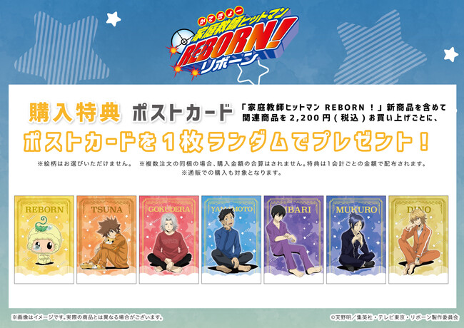 『家庭教師ヒットマンREBORN!』新商品を含めて関連商品を2,200円(税込)お買い上げごとに、ポストカード(全7種)を1枚ランダムでプレゼントしています。通販での購入も対象なので、ぜひご利用ください!