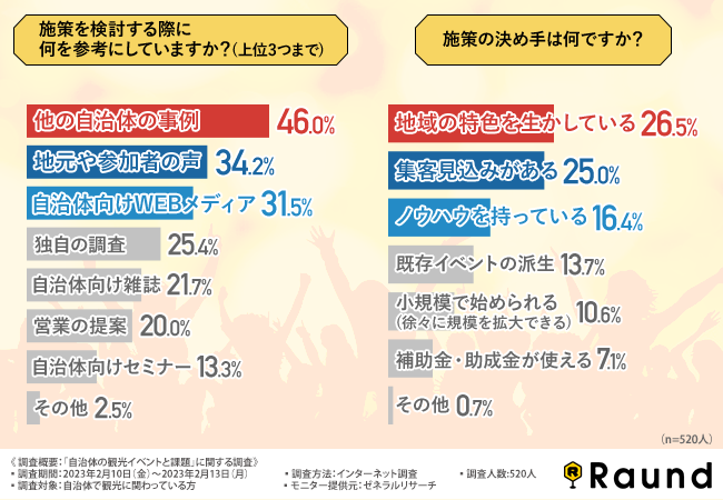 また、イベントをやるからには「集客見込みがある」「ノウハウを持っている」といった勝算があるものを選んでいることから、一人でも多くの方に楽しんでもらい、地域の良さを広めていけるような施策を行うために自治体ごとにさまざまな工夫をしていることが分かりました。