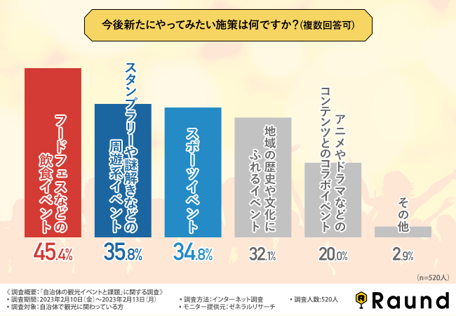「今後新たにやってみたい施策は何ですか?(複数回答可)」と質問したところ、『フードフェスなどの飲食イベント(45.4%)』と回答した方が最も多く、次いで『スタンプラリーや謎解きなどの周遊系イベント(35.8%)』『スポーツイベント(34.8%)』と続きました。