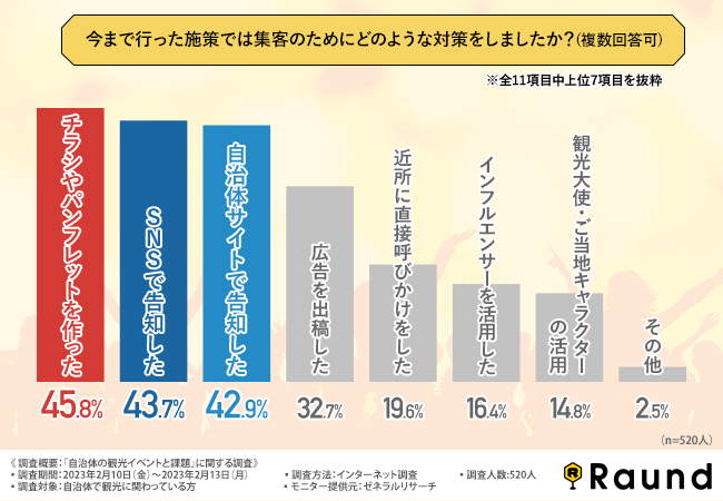 「今まで行った施策では集客のためにどのような対策をしましたか?(複数回答可)」と質問したところ、『チラシやパンフレットを作った(45.8%)』と回答した方が最も多く、次いで『SNSで告知した(43.7%)』『自治体サイトで告知した(42.9%)』と続きました。
