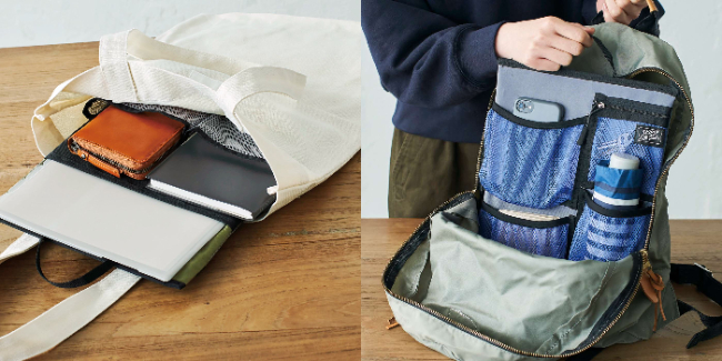スリムなボディーと7つのポケットでバッグの中身を整理整とん「トートの中がすっきり 薄さにこだわったスリムバッグインナー」がフェリシモ「USEDo[ユーズド]」から登場!