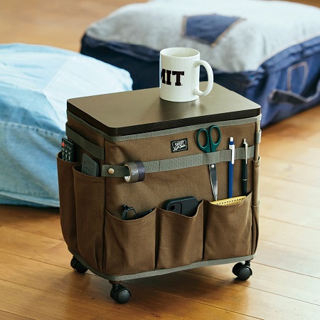 ポケットたくさんで小物をすっきり収納 しっかり綿帆布のコロコロミニテーブル〈ユーズドオリーブ〉