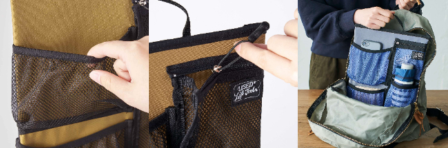 表面のポケットは見やすいメッシュ生地と伸縮性のあるゴム仕様です。かぎなどのこまごましたものは、ファスナー付きポケットが◎。中身をまるっと移動できるので、バッグを変えるときもらくにできます。リュックにもおすすめです。