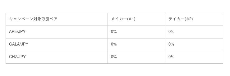 また、エイプコイン(APE)、ガラ(GALA)、チリーズ(CHZ)の取扱開始を記念して、2023年4月12日(水)11時59分まで、期間限定キャンペーンを実施いたします。キャンペーン期間中、APE/JPY、GALA/JPY、CHZ/JPYの取引手数料が無料となります。