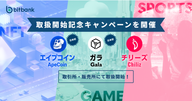 ビットバンク株式会社(本社:東京都品川区、代表取締役社長:廣末紀之、以下当社)は、本日よりエイプコイン(APE)、ガラ(GALA)、チリーズ(CHZ)の取扱いを開始いたしました。