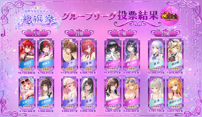 放置少女「第三回放置少女人気キャラ総選挙」のグループリーグでの争いが終わりました。 グループリーグ段階に進出した32名の少女達を4つのグループに分け、各グループのトップ4(合計16名)が次のトーナメント段階に突入!