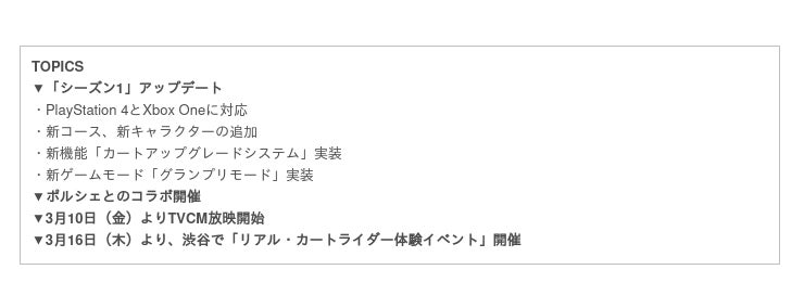 シーズン1では、新たにPlayStation 4とXbox Oneでのプレイに対応いたします。ゲーム内では、8種類の新コースや新キャラクターの追加のほか、カートボディを強化できる「カートアップグレードシステム」や、新モード「グランプリモード」を実装いたしました。また、プレミアムスポーツカーブランド「ポルシェ」とコラボしたカートも登場いたします。