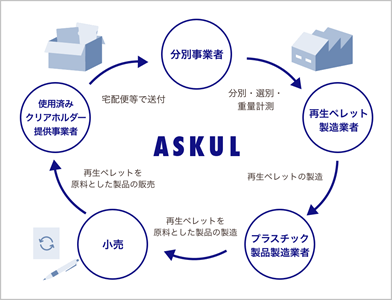 使用済みクリアファイルの回収と再資源化は、アスクル株式会社(本社:東京都江東区、代表取締役社長:吉岡 晃、以下「アスクル」)が運営する「アスクル資源循環プラットフォーム※1」(以下「資源循環プラットフォーム」)を活用しました。