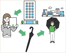当社は「building smiles はたらく人を笑顔に」をスローガンに、オフィスワーカーの皆様に安心・安全・快適な空間を提供できるよう、オフィスビルの運営・管理を行っています。その一環として、2015年から「貸出傘サービス」を提供してきました。