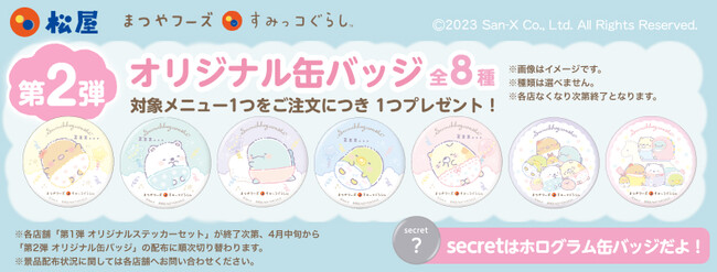 松屋フーズ(本社:東京都武蔵野市、代表取締役社長:瓦葺一利)では、2023年3月中旬より、牛めし・カレー・定食・その他丼の「松屋」において、「すみっコぐらし」とコラボした「オリジナルステッカーセット」「オリジナル缶バッジ」のプレゼント企画を実施いたします。