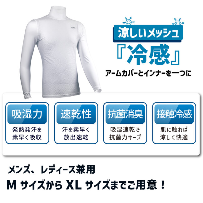 待望の首までカバーし日焼けを防止するハイネックタイプが新登場!アームカバーとシャツが一つになった夏用インナーウェアです。接触冷感で涼しく、胴体部分はメッシュ素材でサラッと着れます。