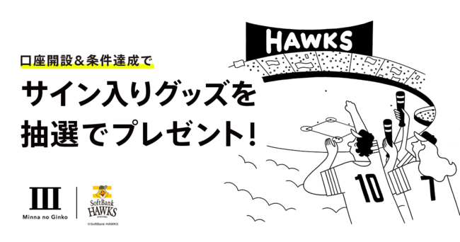 本日より、2023年度における福岡ソフトバンクホークスとのタイアップキャンペーンの第1弾として、みんなの銀行に新たに預金口座を開設された方のうち、特定条件を満たした『「ホークス応援」Box』を作成・入金されたお客さまを対象に、選手のサイン入りグッズが当たるキャンペーンを実施します。