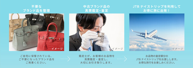(1)実施内容:JTBは大黒屋と連携し、大黒屋がお客様から引き取った中古ブランド品の査定額に10%割り増しした分の「JTBナイストリップ」を、JTBトラベルメンバーステージ会員のお客様に進呈します。