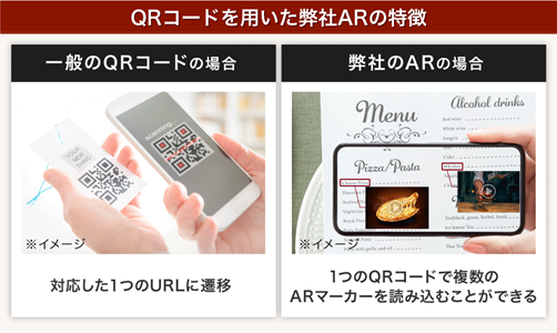 ブラン社の保有するAR技術の強みは、「1:n」で情報が得られるところにあります。従来は、QRコードひとつに対して特定のURLへの遷移でしたが、弊社のAR技術は、QRコードをひとつ読み込むことで、それに対応した複数のARマーカー(特定の画像や文字情報)を読みとることができます。これにより、紙面では伝えきれない量の情報を格段に増やせることに加え、デジタルマーケティング分析も可能になります。