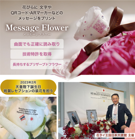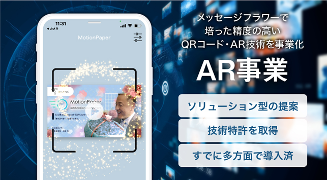 2020年には、新型コロナウイルスの影響により事業の再構築を余儀なくされ、メッセージフラワーで用いていたQRコード及びAR技術を、他のさまざまな分野へ拡大するために、新たに「AR事業」を立ち上げました。これは、スマホのカメラ機能で画像や文字情報を読み取ると動画が流れたり、指定されたURLに遷移し、ユーザーは多様な情報を取得することができるものです。