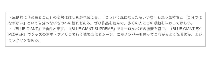 宮本 大さんは、現在『BLUE GIANT EXPLORER』で、ジャズの本場・アメリカで活躍されているテナーサックス奏者です。中学時代に出会ったジャズに心を打たれ、「世界一のジャズプレーヤーになる」という目標を叶えるため、地元である仙台を出て、ヨーロッパからアメリカへと渡りました。お兄さんからサックスをプレゼントされた日から、雨の日も風の日も、毎日必ずサックスの練習に打ち込んできた宮本さん。彼は、サックスを通して「自分の感情をみんなに聞いて欲しい」と語っています。宮本さんのサックスの師匠である由井(ゆい)さん曰く、宮本さんは「人を圧倒できる」プレーヤー。マンガを読む私たちも、その耳に届く迫力のあるサウンドを感じることができるでしょう。