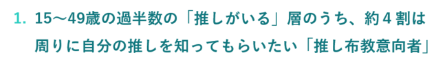 こうした現象の背景には、“推しの布教活動”を通じて、自分の愛する“推し”の活性化に貢献したい、という欲求があるものと推察されます。これは“推し活”が対象に愛情を注ぐ自己完結的なものから、より高次なものへと進化していると捉えられるのではないでしょうか。