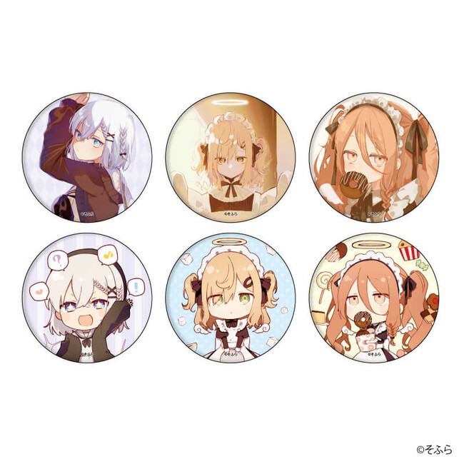 缶バッジは全部で6種類。そふら先生が描くキリッとした流し目が凛々しすぎる銀髪の女の子や、「マジ天使!」と思わず絶叫したくなる天使メイドたちをデザインしています。