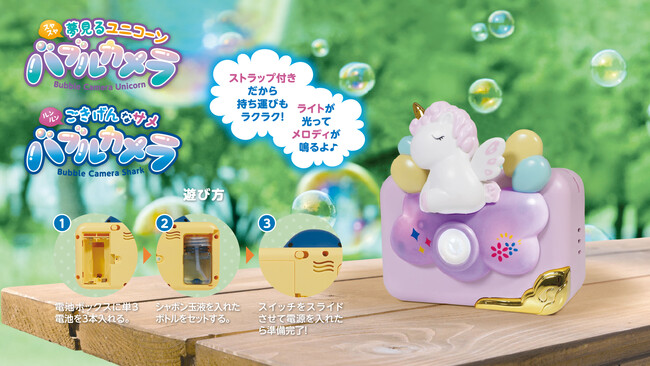 「かわちぃ(ハート)カメラではい、チーズ!」と思いきや、出てくるのは「シャボン玉!?」4月発売のユニコーン&サメの「バブルカメラ」でメロかわしゃぼん空間を演出