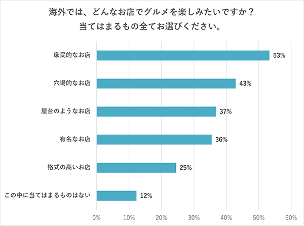 1位は「庶民的なお店」(53%)でした。一方で「格式の高いお店」は25%と、低めの数字となっています。海外ならではの雰囲気を味わうために、その地域の人たちが日常的に訪れる庶民的なお店にこそ入ってみたいと思う方が多いのかもしれません。