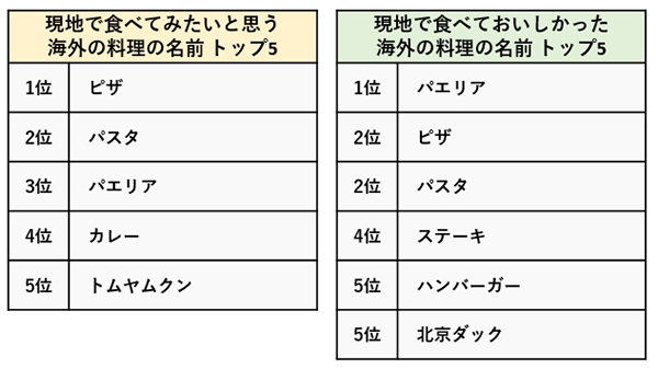それでは、具体的にどんな料理が人気なのでしょう。現地で食べてみたいと思う料理、そして実際に現地で食べておいしかった料理についても聞きました。