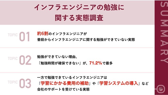 【インフラエンジニア100人に調査】約6割インフラエンジニアが、「普段から勉強ができていない」実態 『勉強時間が確保できない』ほか