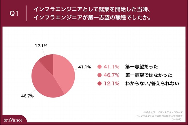 「Q1.インフラエンジニアとして就業を開始した当時、インフラエンジニアが第一志望の職種でしたか。」(n=107)と質問したところ、「第一志望だった」が41.1%、「第一志望ではなかった」が46.7%という回答となりました。