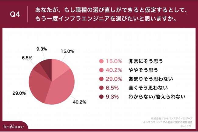 「Q4.あなたが、もし職種の選び直しができると仮定するとして、もう一度インフラエンジニアを選びたいと思いますか。」(n=107)と質問したところ、「非常にそう思う」が15.0%、「ややそう思う」が40.2%という回答となりました。