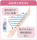 従来のエアゾールタイプに比べて粒子が大きく、低圧噴射で噴射範囲が広いため、スプレーした時の