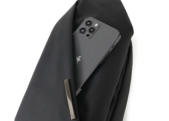 財布、手帳、スマホ、イヤホン、モバイルバッテリー、名刺など必要なものをすべて入れても、余裕のあるサイズ感で装着感を損ないません。