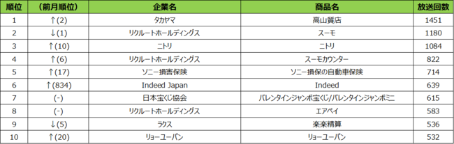 東京・大阪・名古屋・福岡・札幌のエリア別ランキングには、商品別ランキング1位のリクルートホールディングス「スーモ」、2位のニトリ「ニトリ」、3位のソニー損害保険「ソニー損保の自動車保険」、4位のIndeed Japan「Indeed」、7位の日本宝くじ協会「バレンタインジャンボ宝くじ/バレンタインジャンボミニ」の5つがランクインしており、全国的な大量出稿となっていることが見て取れます。また、福岡地区と札幌地区では、タカヤマ「高山質店」、リョーユーパン「リョーユーパン」、北海道ガス「北ガスの電気」など、そのエリアならではのCMがランクインしました。