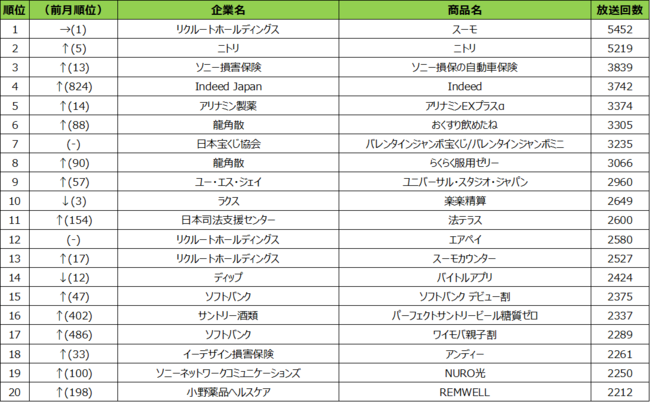 2023年2月度の商品別ランキングは、1位リクルートホールディングス「スーモ」、2位ニトリ「ニトリ」、3位ソニー損害保険「ソニー損保の自動車保険」。リクルートホールディングス「スーモ」は2023年1月度に続いての1位となりました。なお、ニトリ「ニトリ」は2022年7月度から、ソニー損害保険「ソニー損保の自動車保険」は2022年4月度から商品別ランキングにランクインし続けており、時季を問わずCM出稿量が多いといえます。