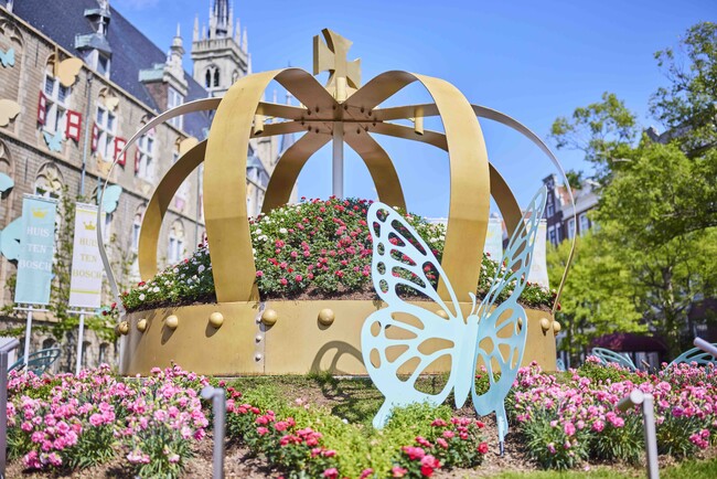 街の中心に位置するアムステルダムシティには、一年中季節のお花を楽しめる「花の広場」があり、この時期には中心に位置する王冠の中にかわいらしいミニバラが色鮮やかに咲き誇ります。フォトスポットとしても人気。