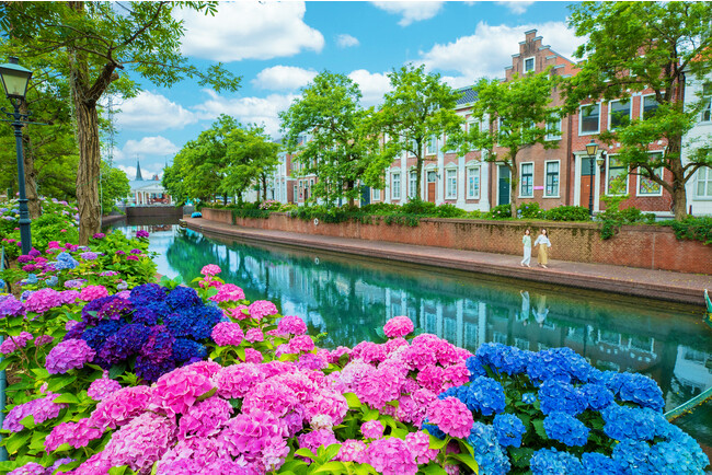 また、5月から6月にかけて「あじさい祭」を開催。あじさいがみずみずしさを増し、ハウステンボスの街並みをエキゾチックに彩ります。ヨーロッパさながらの街並みの中であじさいが一緒に楽しめるのは日本ではここだけ。