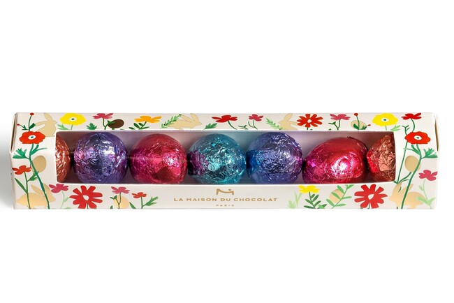 カラフルなアルミ紙に包まれた、4種の卵型プラリネの詰め合わせ。