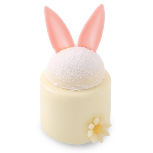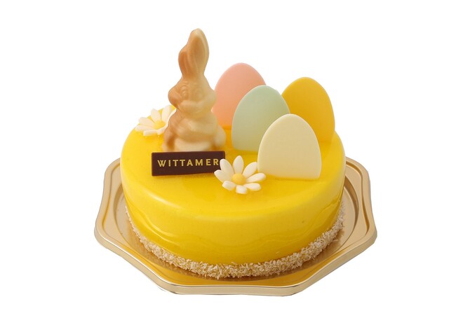 爽やかなオレンジのムースに、ミルクチョコレートとアーモンドプラリネのムースを閉じ込めました。春の訪れを祝うミニうさぎを飾って。
