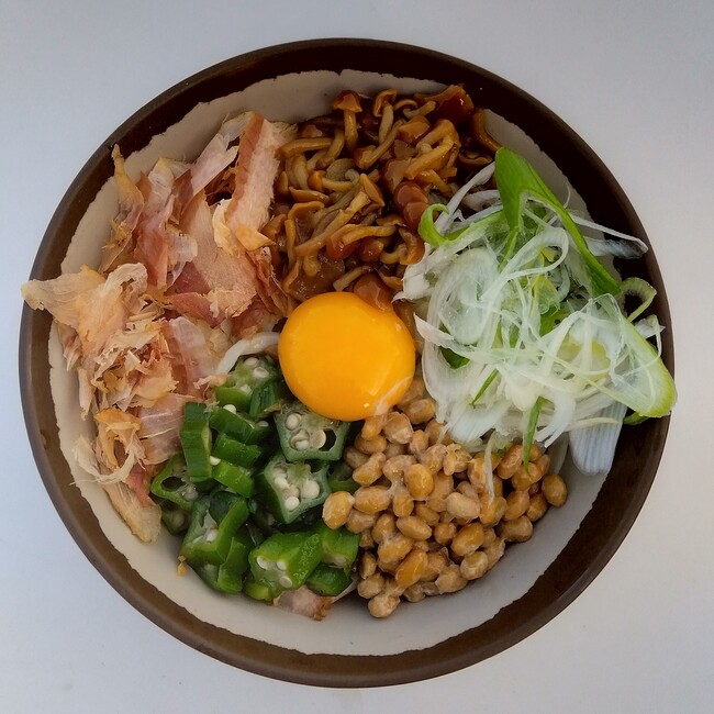 納豆・オクラ・なめこ・カツオ節・ネギ・卵黄を使用した具沢山うどん。