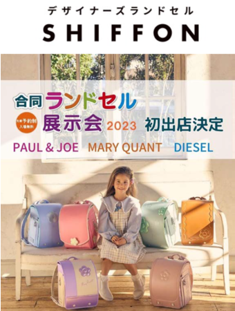 株式会社Eストアー (本社:東京都・代表取締役COO社長 柳田 要一 以下、Eストアー)のグループ企業である株式会社SHIFFON(本社:東京都・代表取締役 西村 健太 以下、SHIFFON)が、全国8会場で開催される「合同ランドセル展示会2023」に出展いたしますのでお知らせいたします。同展示会では、「DIESEL」、「PAUL & JOE」などのブランドランドセル2024年度ご入学者向けモデルと既存モデル全95色を取り揃えて展示販売いたします。