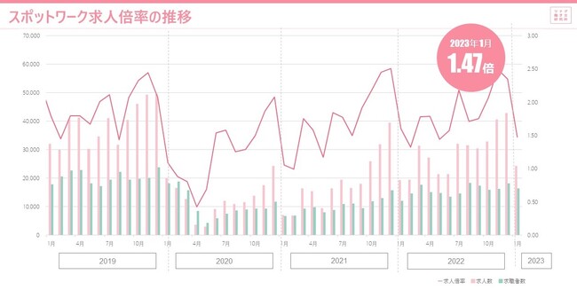 1.単発、短時間、短期間で働くスポットワークの2023年1月度求人倍率は1.47倍