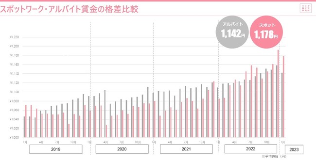 3.スポットワーカーの平均時給は1,178円。3か月連続で通常アルバイト平均時給を上回る