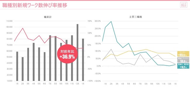 2.新規ワーク数は、対前年比で+36.9%。主要職種ではコンビニスタッフが+65.5%と伸長
