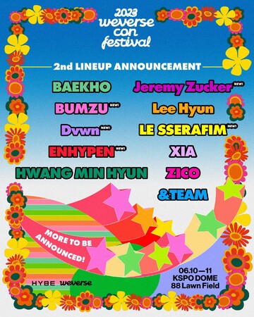 HYBEは、6月10日・11日の2日間、韓国ソウルのオリンピック公園 KSPO DOME(体操競技場)と88芝生広場で開催される2023「Weverse Con Festival」の第2弾出演アーティストラインナップを発表しました。