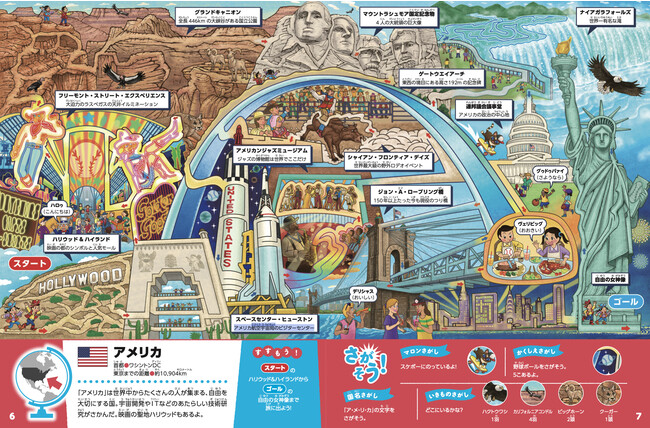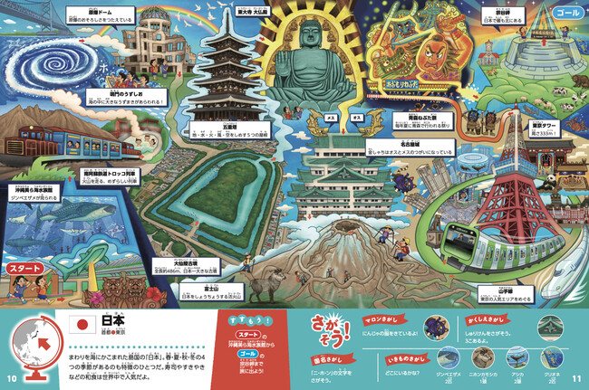 紹介している国は全部で12カ国。簡単な解説とともに名所を紹介しています。迷路の中には、国名の文字が隠されていたり、その国固有の生きものの絵が描かれていたりするので、迷路をしながら同時にさがし絵も楽しめます。
