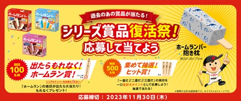 3月27日(月)より開始される「過去のあの賞品が当たる!シリーズ賞品復活祭!」キャンペーンは、新しい応募キャンペーンに移行する前の最後のキャンペーンです。これまでの感謝の気持ちを込め、景品には、過去5年間で最も応募総数が多かった賞品である「ホームランバー抱き枕」をご用意いたしました。パッケージ・当たり棒・アイスが着脱可能な“巨大ホームランバー”はユニークな見た目がかわいらしく、抱き心地も抜群です。