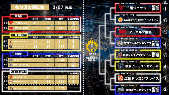 昨シーズンの2地区制のレギュレーションと異なり、3地区制となった今シーズンはチャンピオンシップホーム開催権利を獲得するのも容易ではありません。クォーターファイナルのホーム開催は各地区1位の3チーム、各地区2位の最上位1位チームの計4チームとなります。