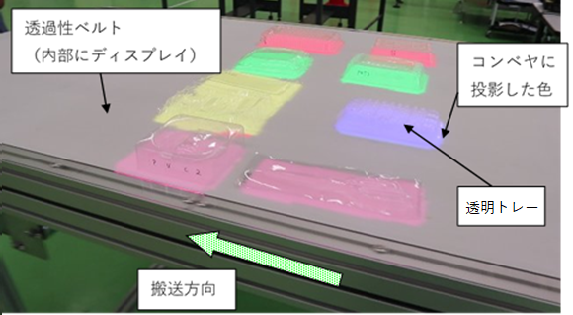 開発した装置は,ベルトコンベヤにディスプレイを内蔵し,コンベヤ上部に画像や文字情報を投影できるようにしています。材質判定機で得られた透明トレーの位置・形状・材質情報を元に,搬送される透明トレーの下部に材質に合わせた色を投影することで,周囲の環境に影響されず識別が容易になり,かつコンベヤ上の密度を高めることで,最大で機械の3倍のスピードで大量に処理できるようになりました。また,従来の機械による自動選別装置に比べおよそ1/3のスペースで,人と機械が協働する半自動化を実現しました。